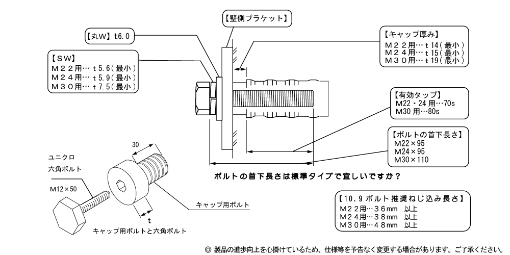 | 規格 | キャップ | 標準付属(10.9) ボルト首下長さ (全ネジ) |